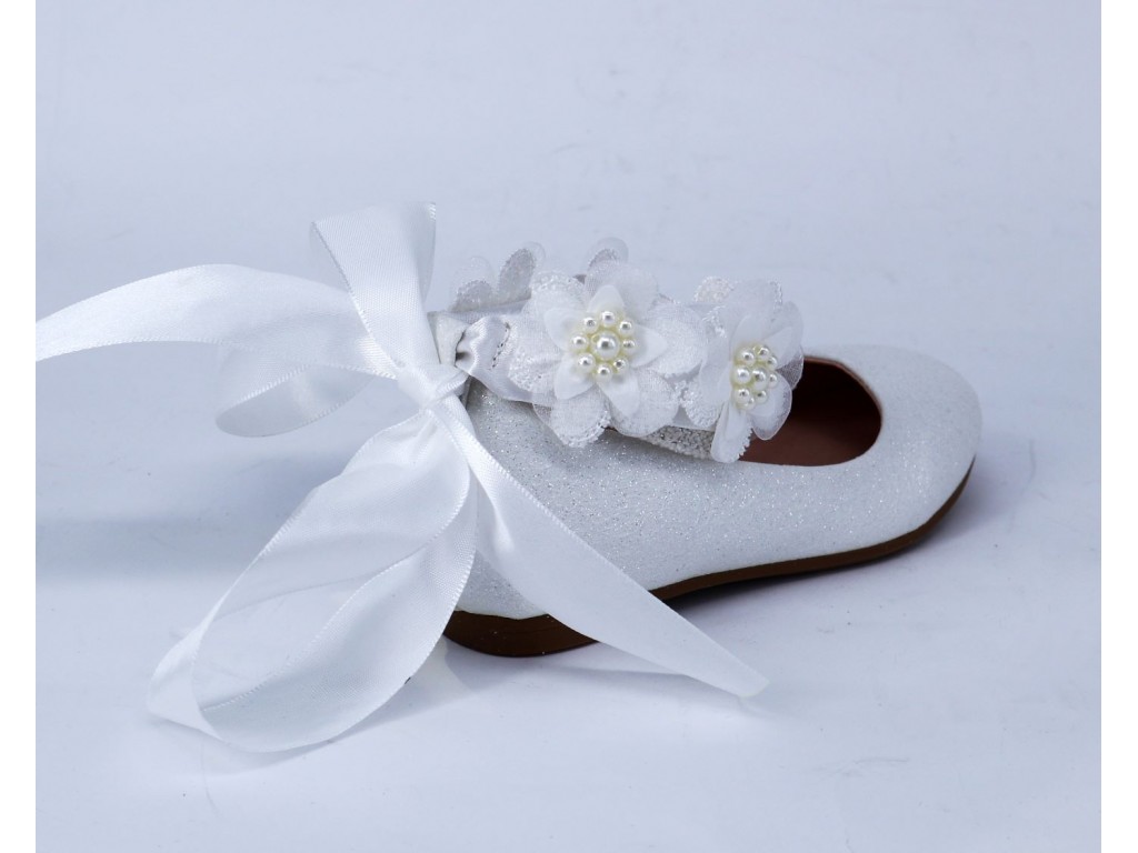 FRANCESITA DE NIÑA COLOR BEIGE PARA COMUNIÓN. MATERIAL POLIPIEL, SE COGE AL TOBILLO CON UNA CORREA ADORNADA CON FLORES DE TELA.