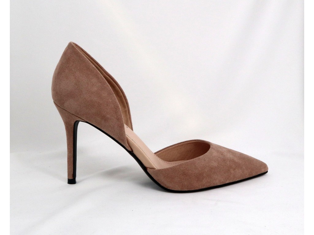 STILETTO DESTALONADO DE VESTIR. COLOR FUCSIA, MATERIAL ANTELINA. TACÓN DE 8.5 CM APROX.