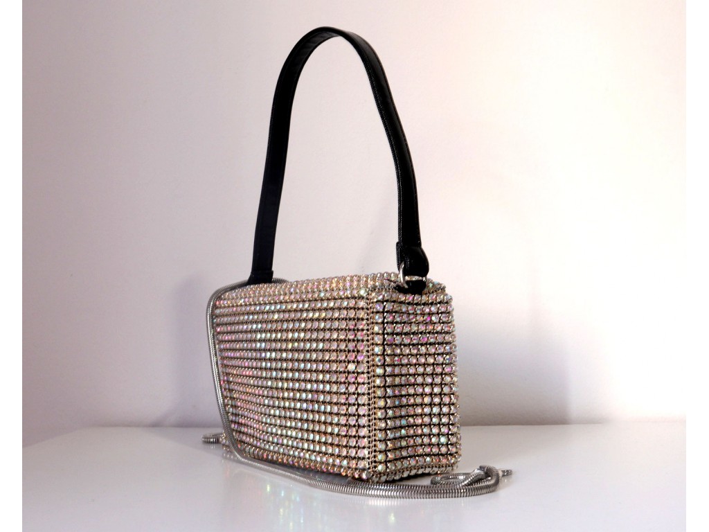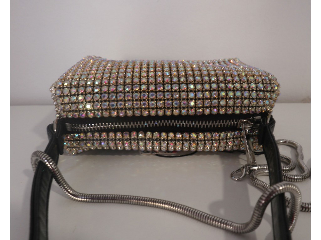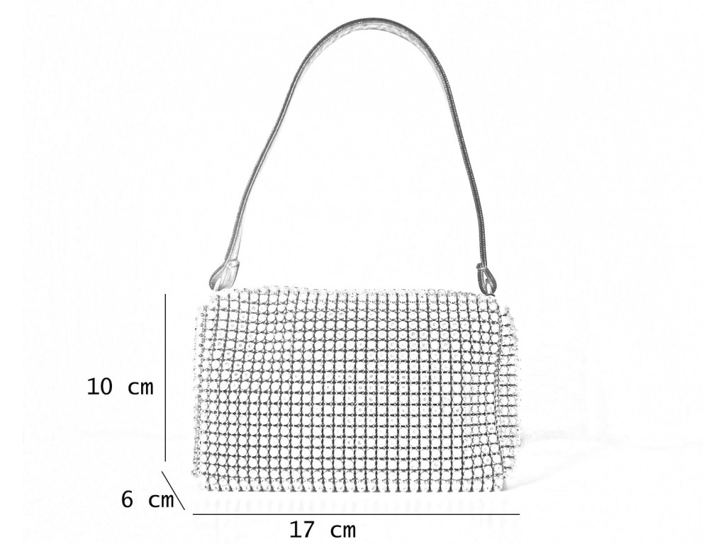 CLUTCH DE PIEDRECITAS BLANCAS Y BRILLO SOBRE PLATA. PARTE TRASERA COLOR PLATA SATINADA. MONTURA Y CADENA PLATEADAS. DIMENSIONES 20*12*3 CM.