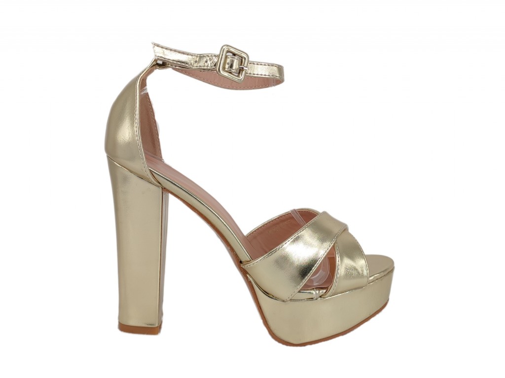 SANDALIA VESTIR COLOR ORO CON TACÓN CUADRADO DE 12 CM APROXIMADAMENTE. PLATAFORMA DE 4 CM. MATERIAL POLIPIEL, PULSERA AL TOBILLO.