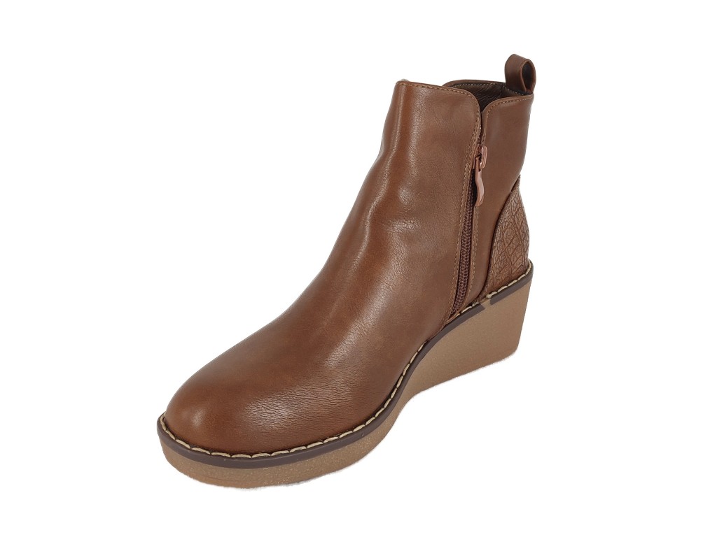 BOTÍN CAMEL DE CUÑA BAJA (5 CM). CREMALLERA DE ADORNO EXTERNA. CREMALLERA INTERIOR. SUELA DE GOMA