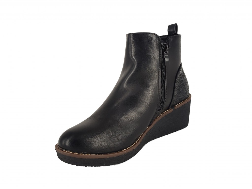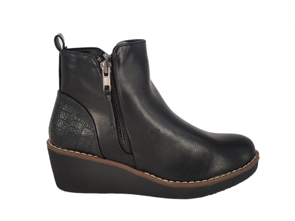 BOTÍN NEGRO DE CUÑA BAJA (5 CM). CREMALLERA DE ADORNO EXTERNA. CREMALLERA INTERIOR. SUELA DE GOMA.