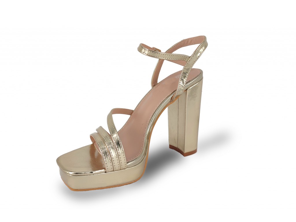 SANDALIA DORADA DE ANTELINA PARA FIESTA. TACÓN DE 12 CM Y PLATAFORMA DE 3 CM APROXIMADAMENTE.