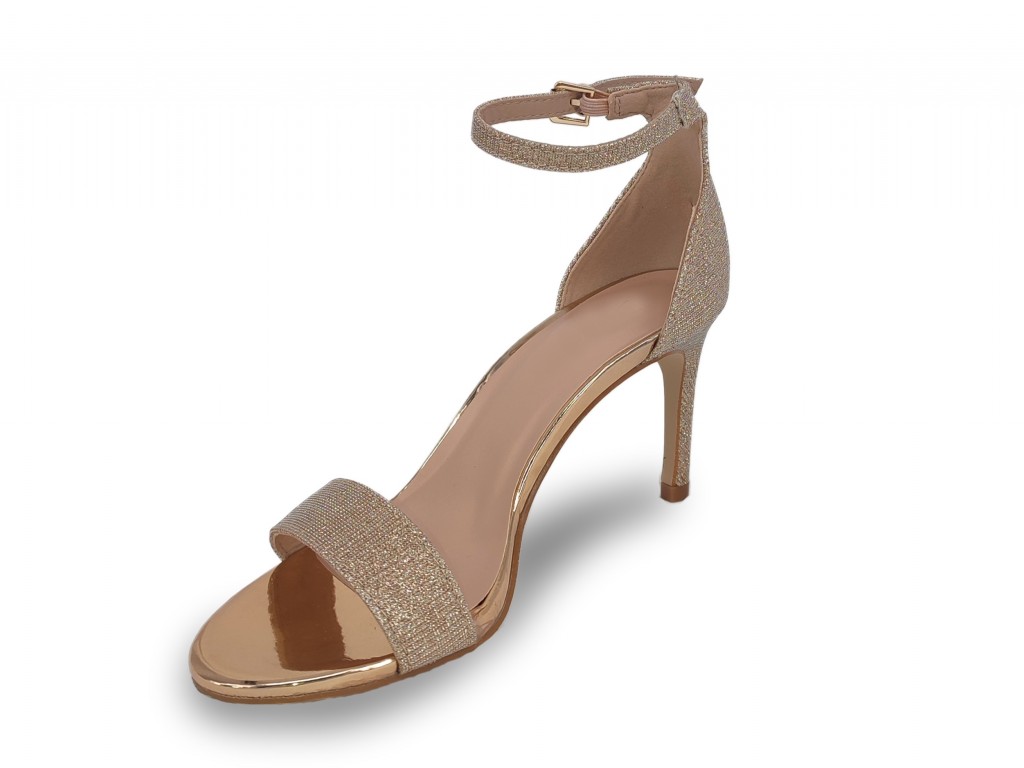 SANDALIA PARA FIESTA COLOR CHAMPAN CON BRILLO. TACÓN FINO DE 8 CM. ABROCHADA AL TOBILLO CON PULSERA.