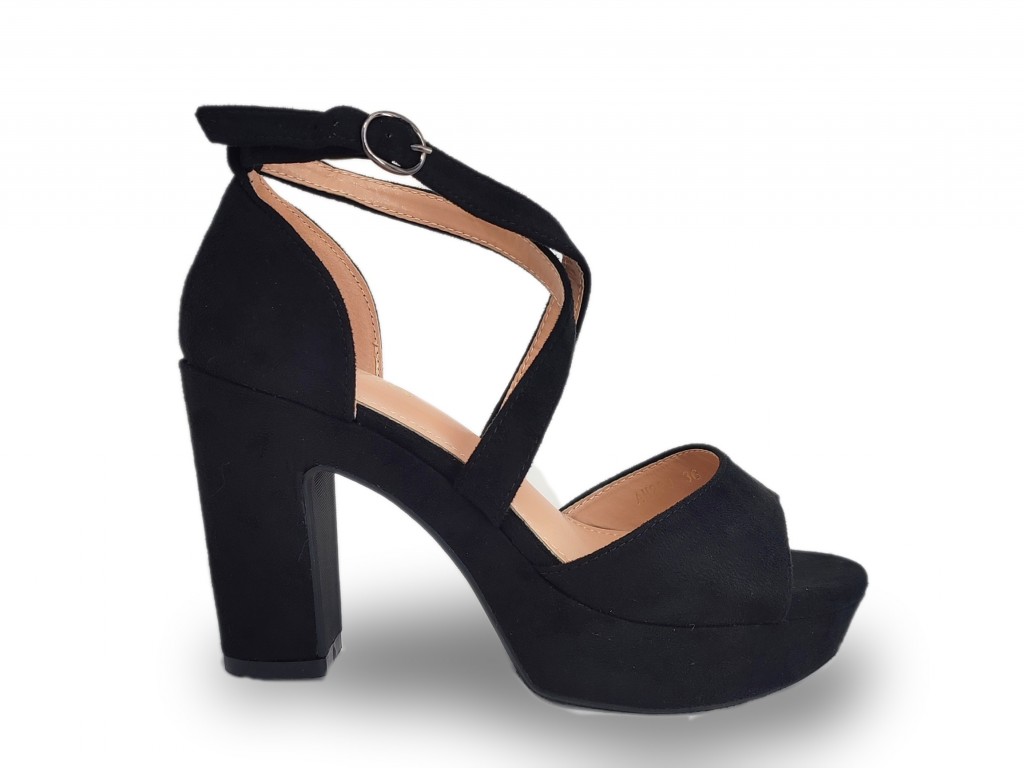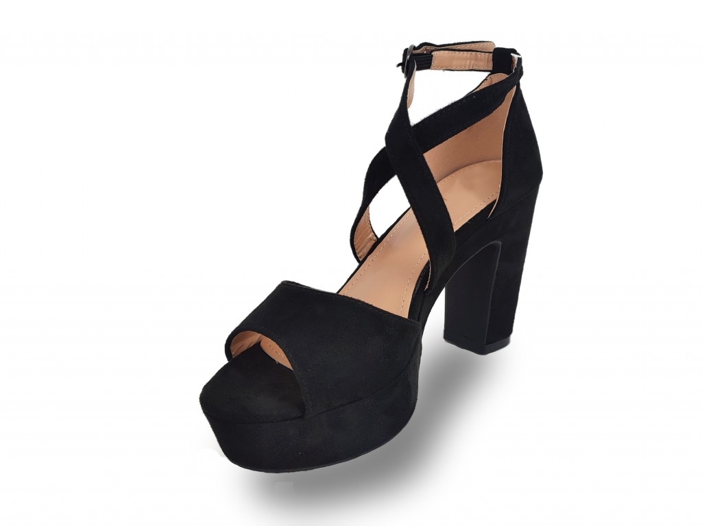 SANDALIA DE VESTIR DE ANTELINA COLOR NEGRO. TALÓN CUBIERTO, CON DOS TIRAS QUE SE CRUZAN EN EL EMPEINE. TACÓN GRUESO DE 10 CM Y PLATAFORMA DE 3.5 CM APROXIMADAMENTE.