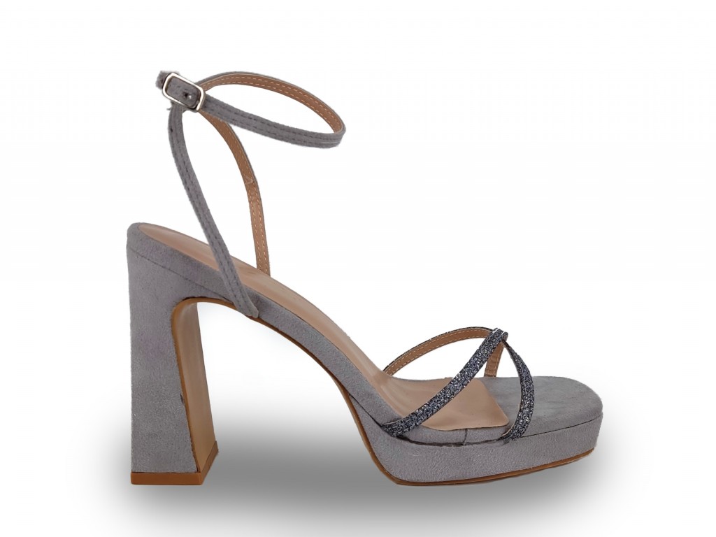 SANDALIA DE FIESTA COLOR GRIS CON DETALLE EN BRILLO PLATEADO. TACÓN DE 11 CM Y PLATAFORMA DE 2.5 CM APROX.