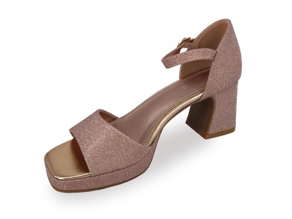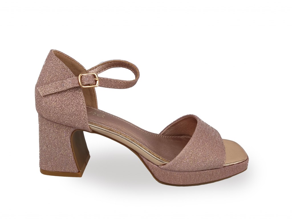 SANDALIA COLOR CHAMPÁN BRILLANTE PARA FIESTA. TACÓN DE 6.5 CM , PLATAFORMA DE 1.5 CM APROX.