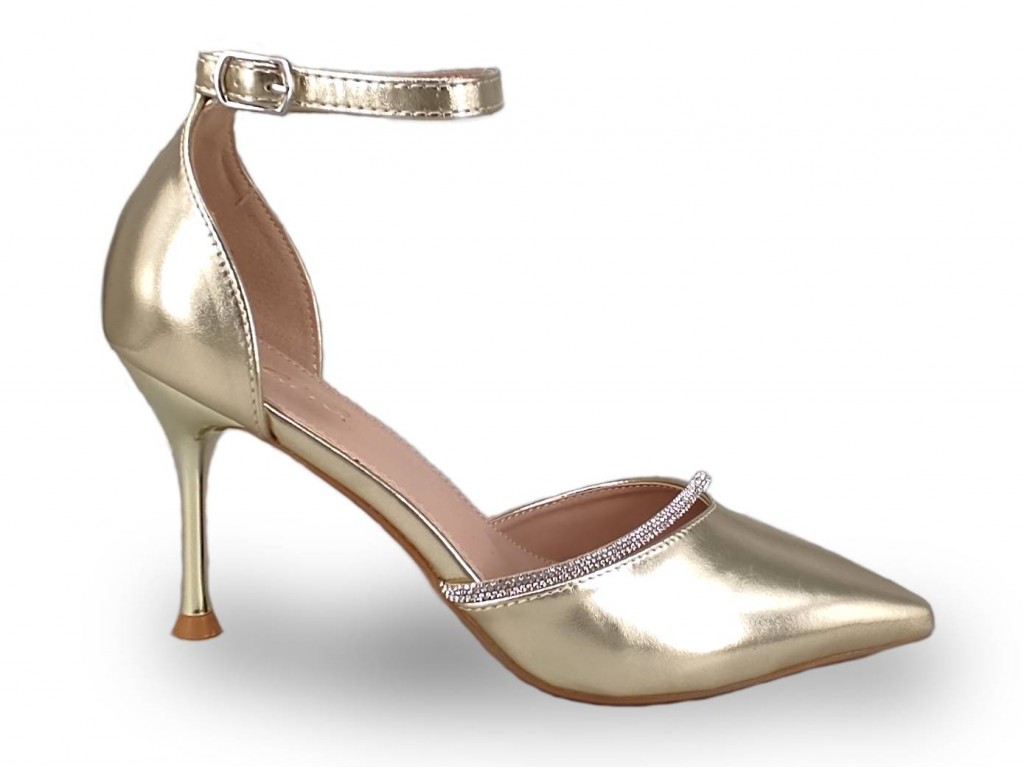 STILETTO DE COLOR DORADO SATINADO CON DETALLE DE TIRA DE STRASS. ABROCHADO AL TOBILLO CON PULSERA. TACÓN DE 8.5 CM APROX.