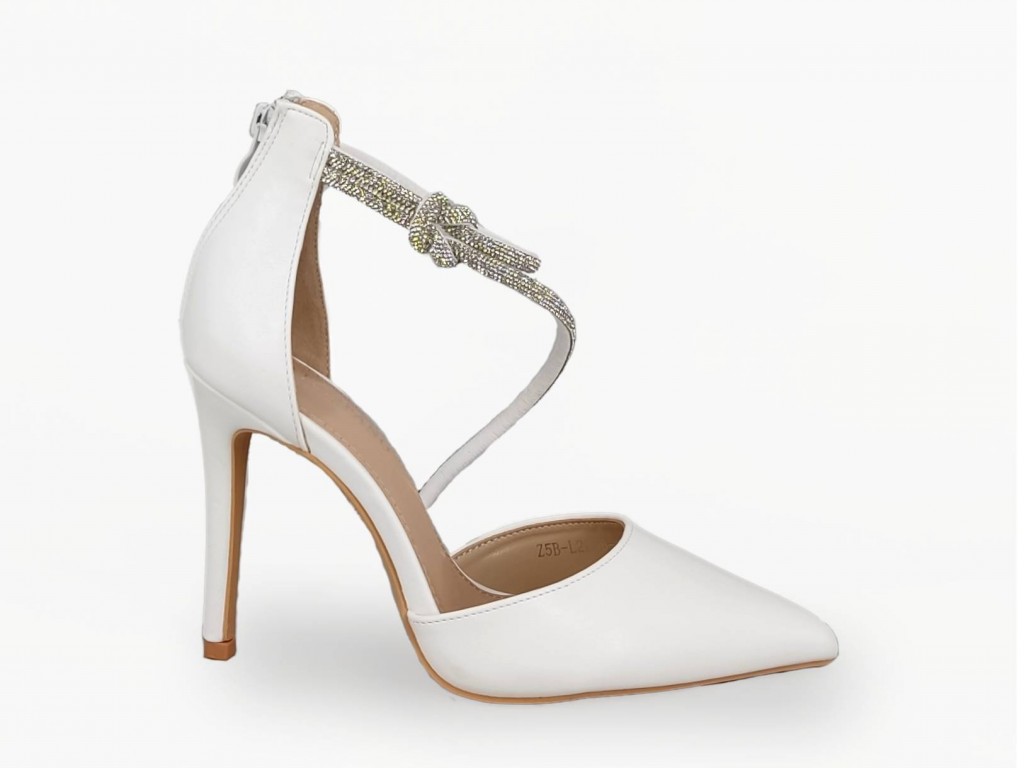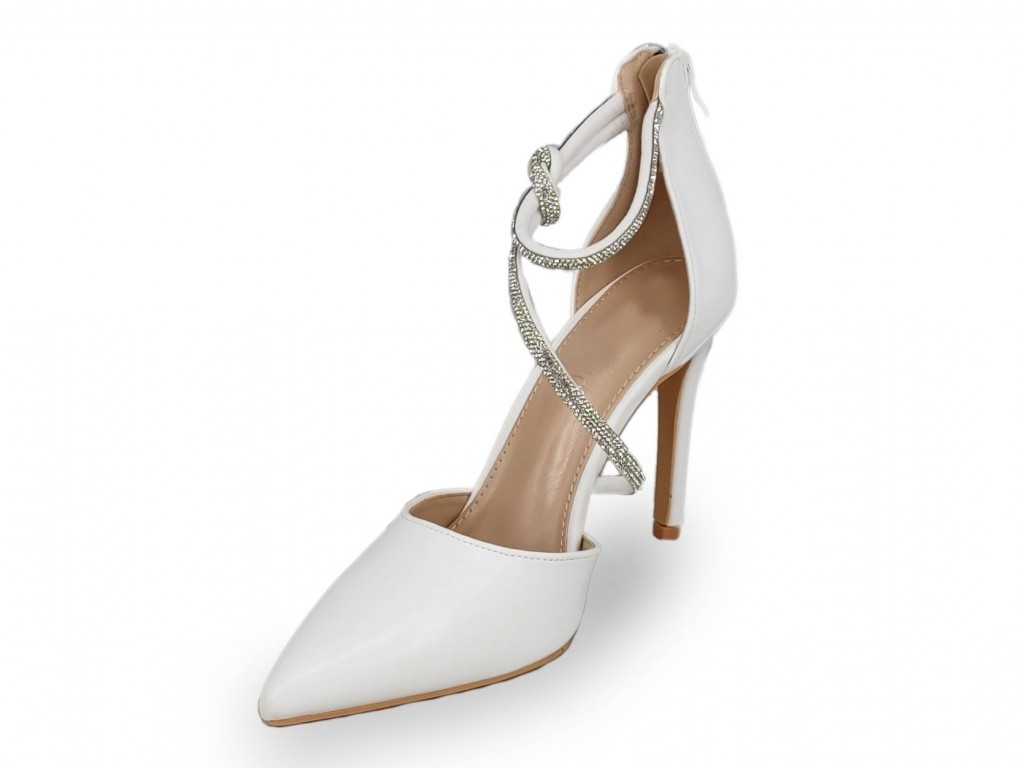 STILETTO DE POLIPIEL COLOR BLANCO. TACÓN FINO DE 10 CM APROX. TIRA DE STRASS QUE RECORRE EL EMPEINE Y SE ABROCHA AL TOBILLO CON HEBILLA. IDEAL PARA FIESTA Y EVENTOS.