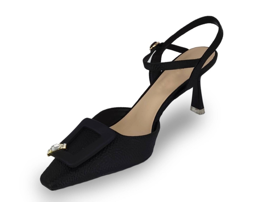 STILETTO COLOR NEGRO DE POLIPIEL. PULSERA AL TOBILLO, ADORNO TIPO HEBILLA CON CRISTAL. TACÓN DE 7.5 CM APROX.