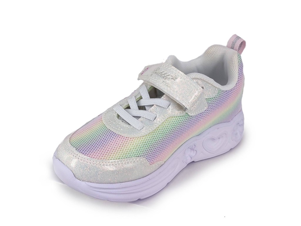 DDEPORTIVA COLOR BLANCO CON GLITTER TORNASOLADO DE COLORES. SE ENCIENDE LA LUZ A CADA PASO. TALLAS DESDE LA 23 A LA 35. MARCA BUBBLE.