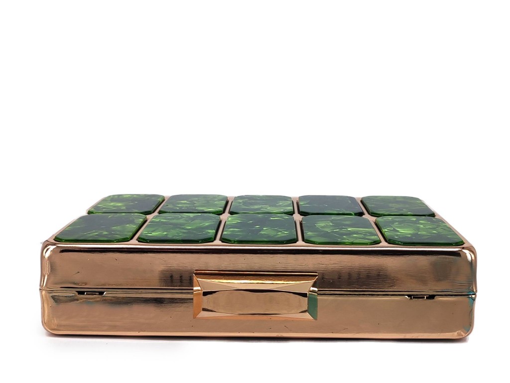 CLUTCH METÁLICO RÍGIDO COLOR ORO CON PLACAS INCRUSTADAS DE COLOR VERDE NACARADO. DIMENSIONES: 16.5*11*3,5 CM APROX.