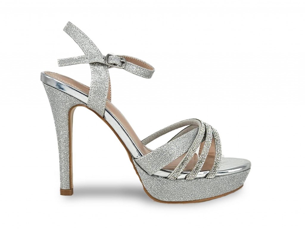 SANDALIA PARA FIESTA COLOR PLATA CON CRISTALES. TACÓN FINO DE 13 CM APROX. PLATAFORMA DE 3.5 CM.