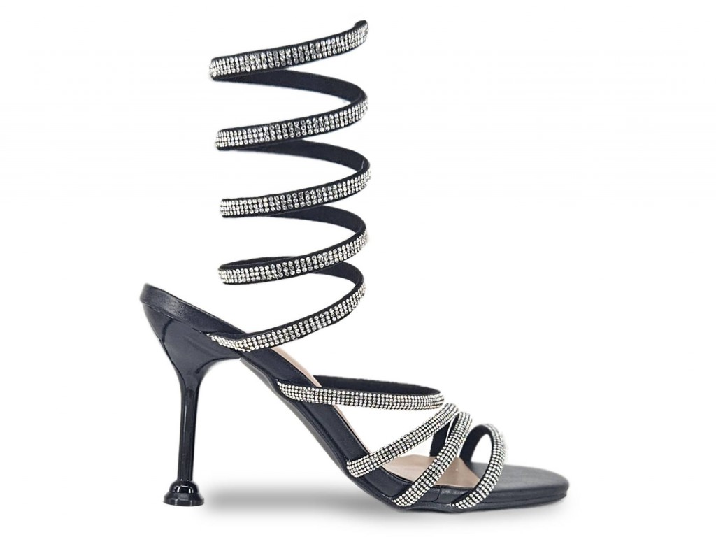 SANDALIA COLOR NEGRO CON STRASS. SE ENROLLA A LA PIERNA MEDIANTE UNA ESPIRAL QUEDANDO RÍGIDA. TACÓN DE 10 CM APROX.