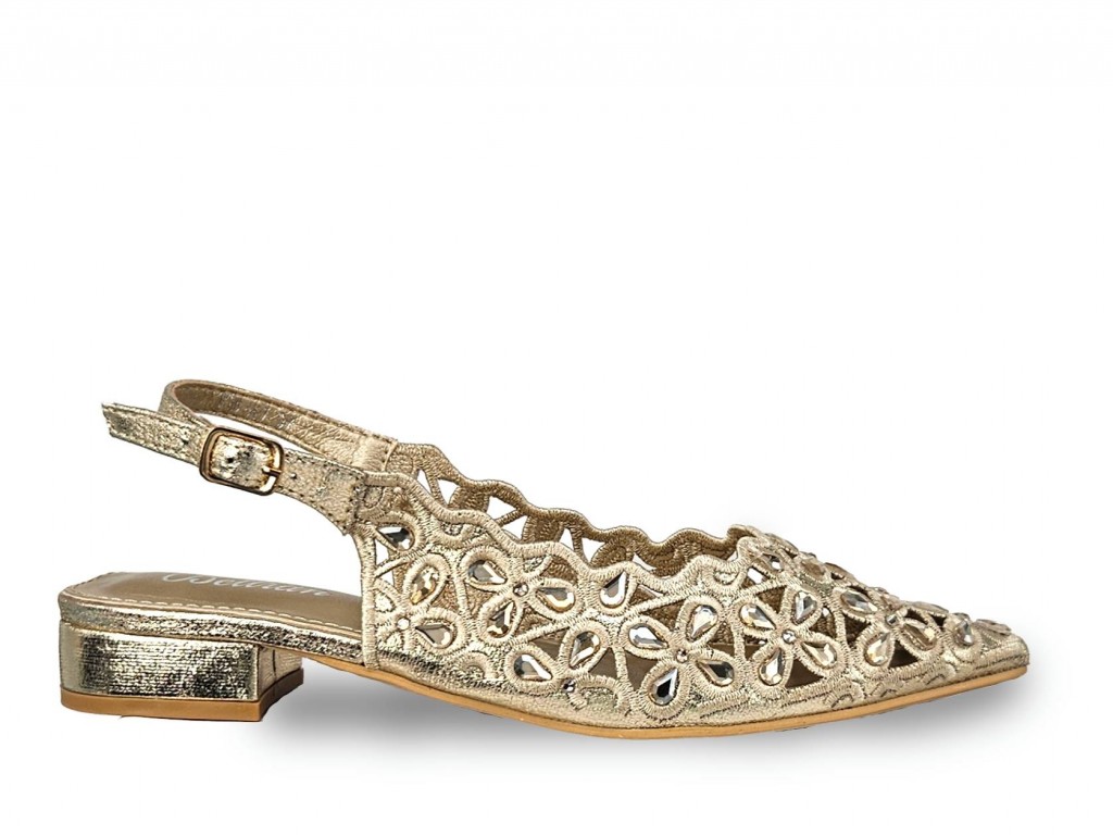 ZAPATO PLANO DESTALADO PARA FIESTA. MATERIAL CALADO COLOR DORADO CON CRISTALES. TACÓN DE 3 CM.