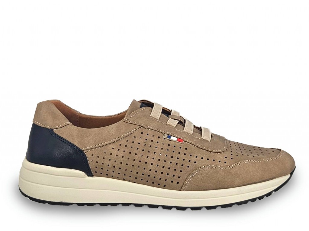 ZAPATILLA URBANA DE HOMBRE COLOR CAQUI CON DETALLE AZUL MARINO DETRÁS. MATERIAL CALADO, CORDONES ELÁSTICOS.