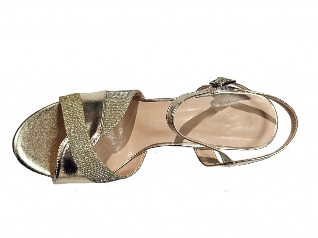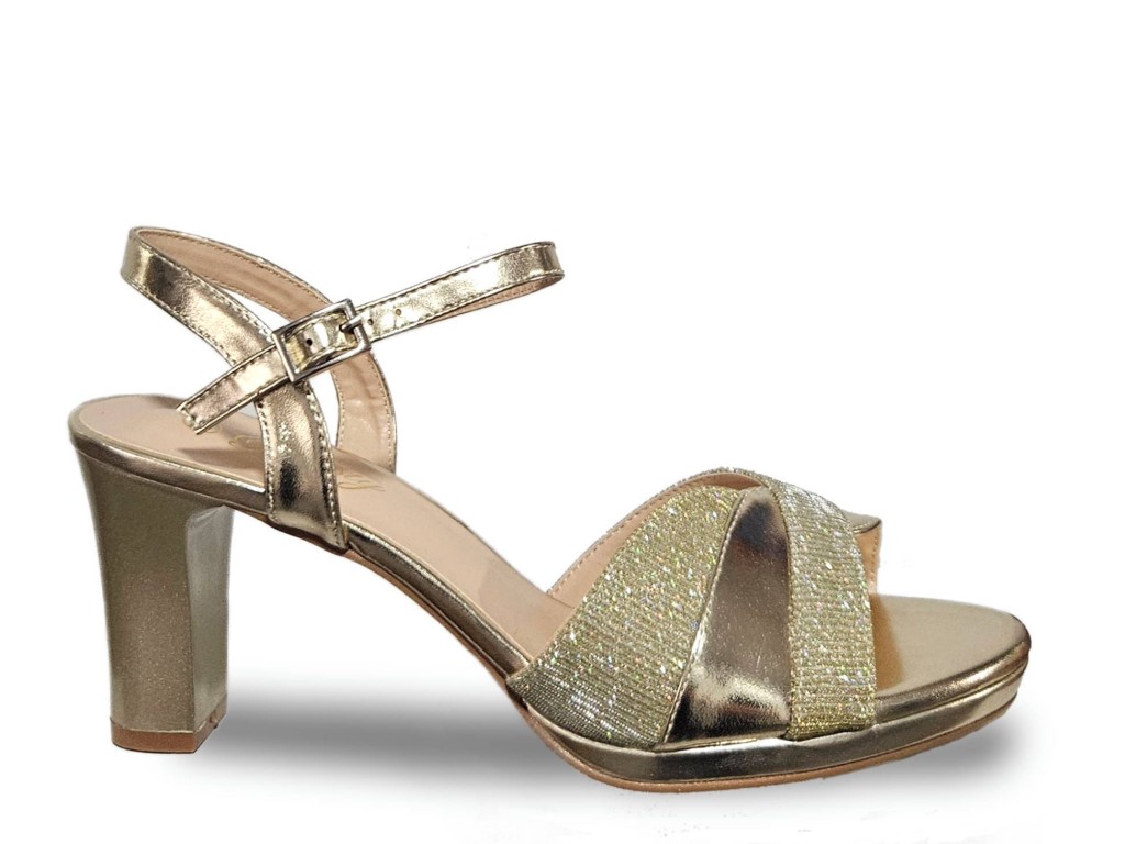 SANDALIA PARA FIESTA COLOR ORO. MEZCLA DE MATERIALES: BRILLANTE Y SATINADO. TACÓN DE 8 CM APROX. PLATAFORMA DE 1.5 CM.