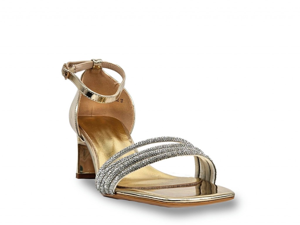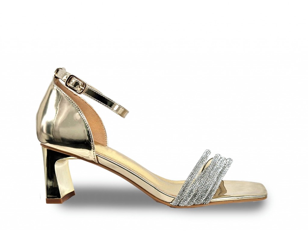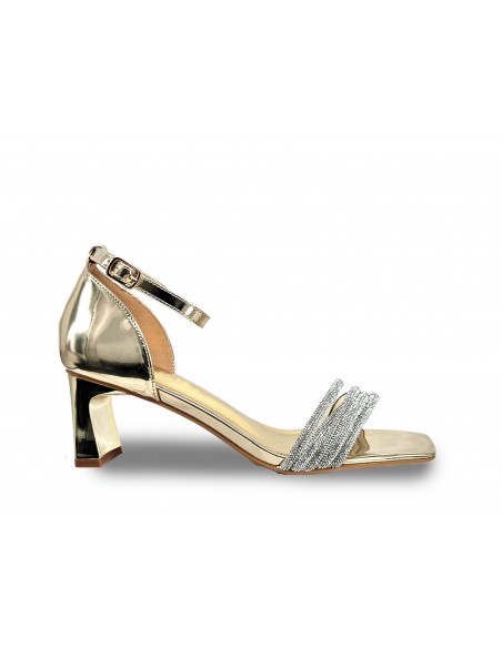 SANDALIA PARA FIESTA Y EVENTOS COLOR ORO. PALA CON TIRAS DE STRASS. TACÓN DE 6 CM APROX. TALÓN CUBIERTO, SE ABROCHA CON PULSERA AL TOBILLO.