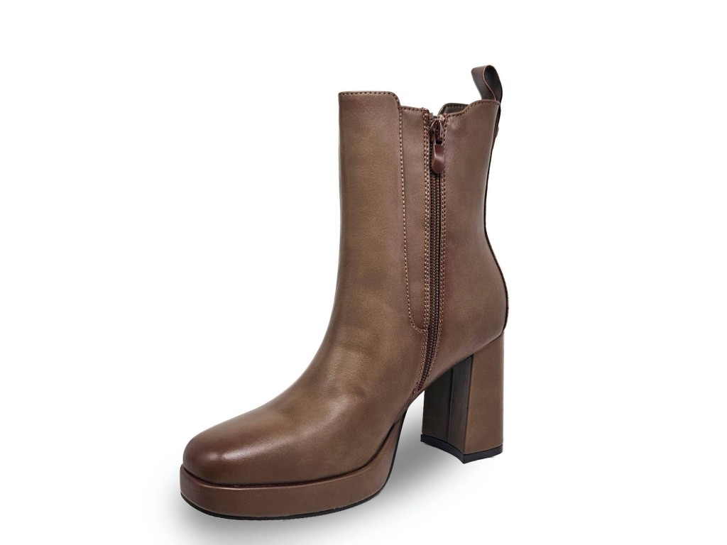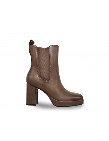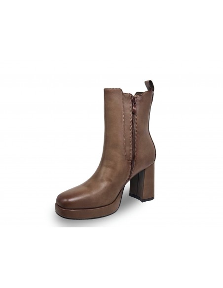 BOTÍN DE POLIPIEL COLOR KHAKI, TACÓN CUADRADO DE 9 CM APROX. PLATAFORMA DE 2 CM. CREMALLERA EN PARTE INTERNA,