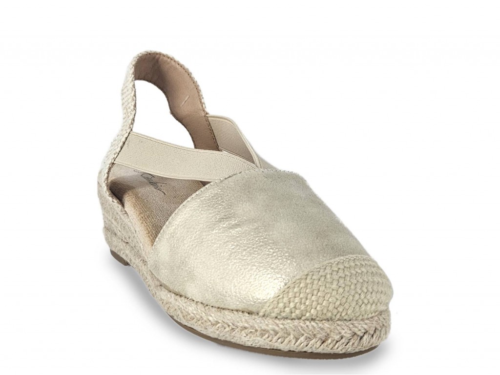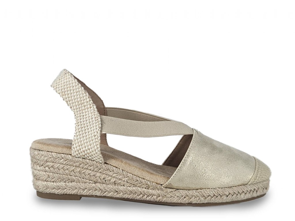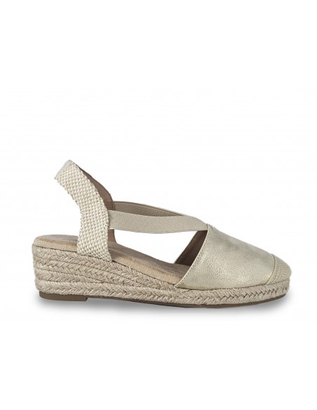 ESPARDEÑA TIPO VALENCIANA COLOR DORADO CON CUÑA DE ESPARTO DE 5 CM APROX. SE AJUSTA CON DOS GOMAS EN EL EMPEINE.