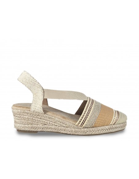 ESPARDEÑA TIPO VALENCIANA DE TONOS NATURALES CON CUÑA DE ESPARTO DE 5 CM APROX. SE AJUSTA CON DOS GOMAS EN EL EMPEINE.