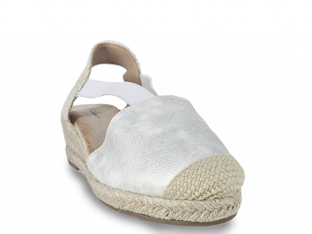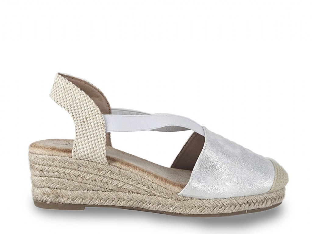 ESPARDEÑA TIPO VALENCIANA COLOR PLATA CON CUÑA DE ESPARTO DE 5 CM APROX. SE AJUSTA CON DOS GOMAS EN EL EMPEINE.