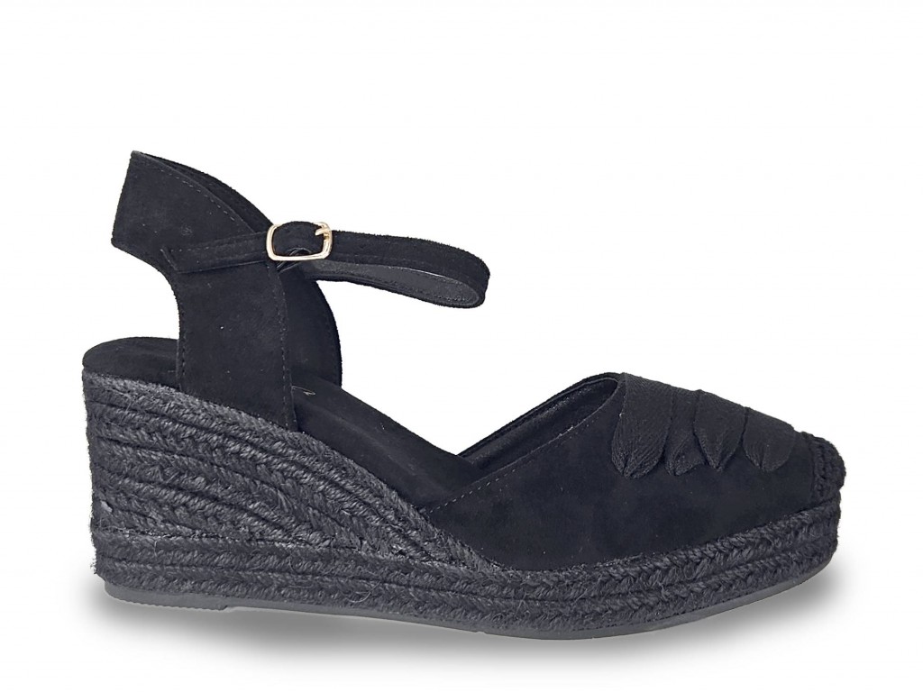 ALPARGATA COLOR NEGRO CON CUÑA DE ESPARTO. ADORNO DE LAZOS DELANTE. CUÑA DE 8 CM APROX. PLATAFORMA DE 2 CM.