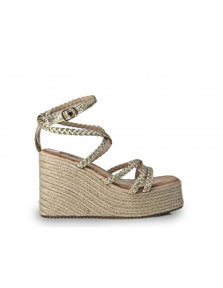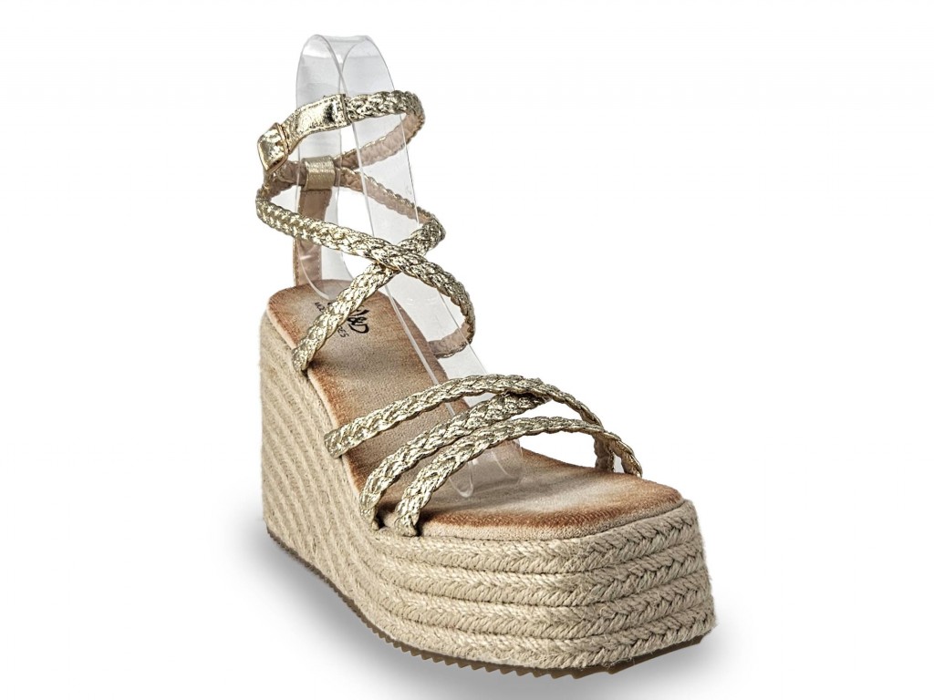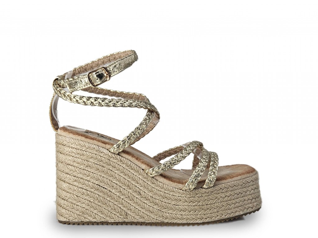 SANDALIA DORADA DE TIRAS CON CUÑA DE ESPARTO DE 11 CM APROX. PLATAFORMA DE 5 CM.