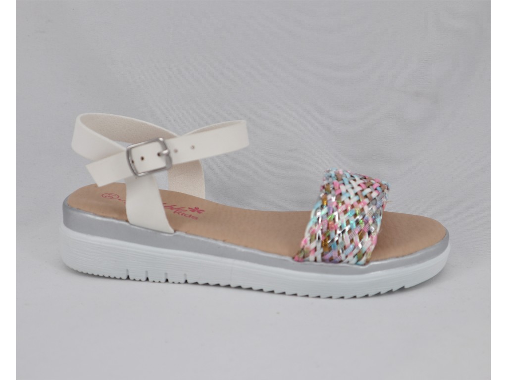 SANDALIA BLANCA CON TIRAS DE COLORES SUAVES. ADORNO DE PURPURINA MULTICOLOR ALREDEDOR DE LA PLANTILLA. CIERRE CON HEBILLA, MATERIAL SINTÉTICO. MARCA BUBBLE. TALLAS DESDE LA 20 HASTA LA 31.